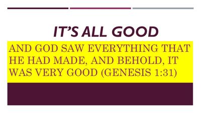 The response I give most often when asked how I am doing is, “It’s all good.” A few moments before beginning to write this devotion someone asked me how I was doing and instantly the response was “It’s all good.” I took a few moments to think about why I give that response. The reason is that all God has created (including today and every day) is good.